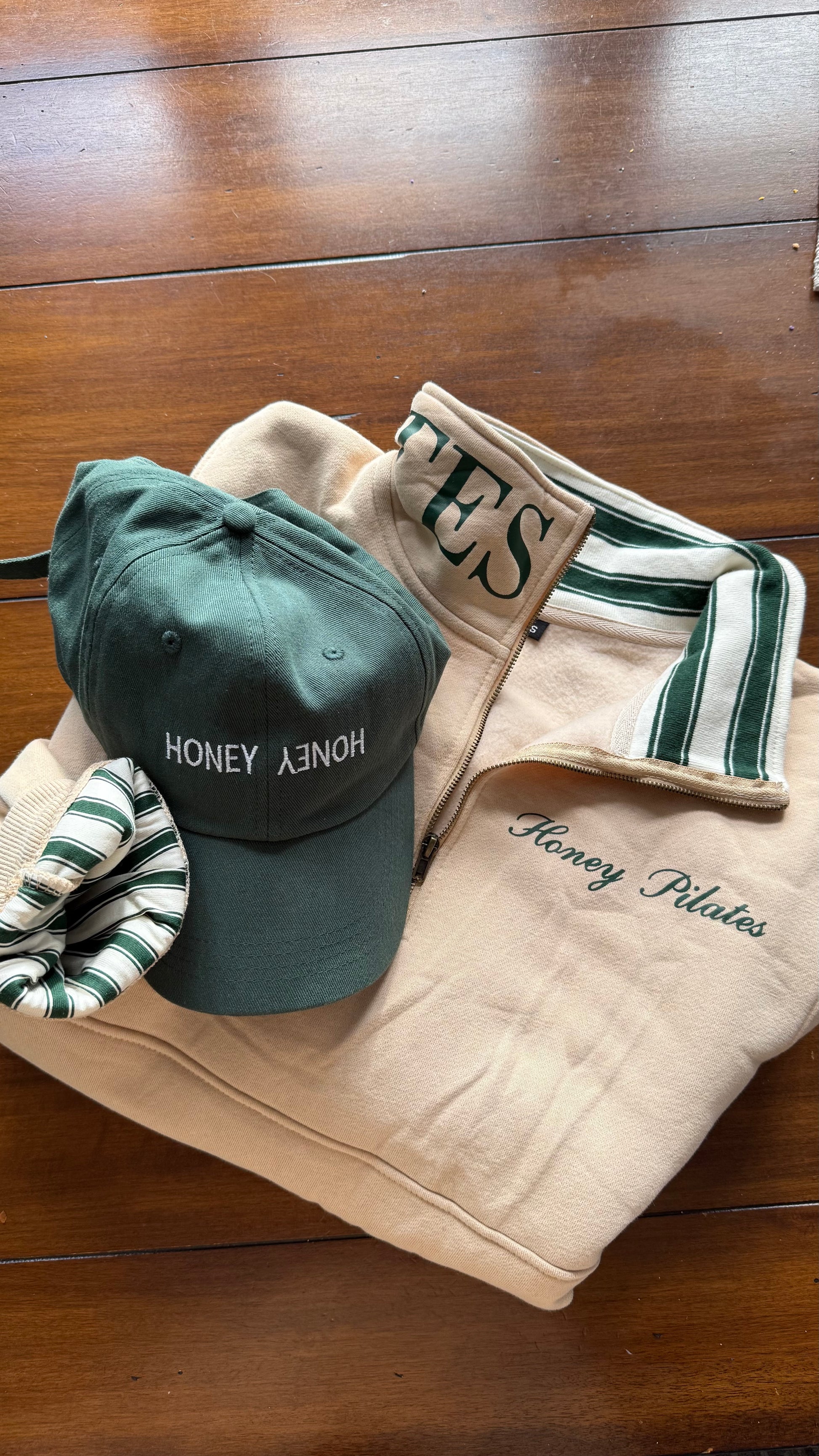 Don’t Sweat It quarter zip sweat shirt is in our latte shade and pathos green accents. Custom lined arms for a statement sleeve when you cuff it, custom stripes on the inner collar and our logo printed around the outer collar, brass zipper and our Honey Pilates crest printed in brass on the back. Nothing to sweat when wearing this.